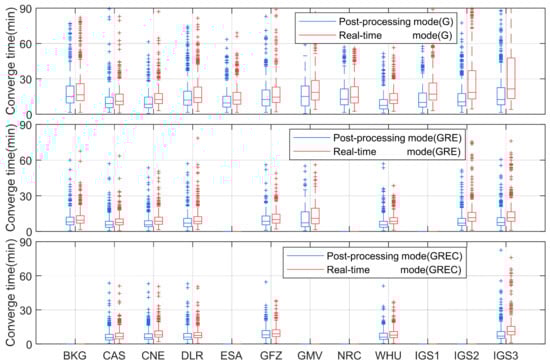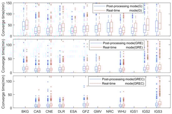 Convergence time is an important indicator for evaluating precise point positioning. The convergence time for different combinations and SSR products was counted and is shown as boxplots in Figure 8. In these boxplots, the central mark represents the median, and the bottom and top edges of the box represent the 25th and 75th percentiles, respectively. Outliers are plotted individually using the plus symbol []. For each daily (24-h) PPP solution, the position was considered to have converged when the position errors stayed within 20 cm for ten consecutive epochs.