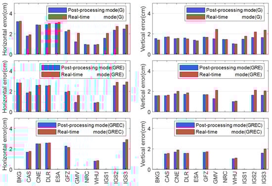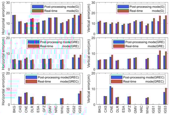 Figure 9 presents the positioning accuracy of static PPP for different SSR products. The positioning errors for static PPP in real-time mode are slightly larger than in post-processing mode. The positioning accuracy of GMV in real-time mode was worse than in post-processing mode, which was mainly because the instability of GMV SSR corrections. On the whole, the results of static PPP in real-time mode with GPS only for all SSR products had an accuracy of better than 3.2 cm in the horizontal and 2.5 cm in the vertical directions, respectively. The best performance results were from WHU with a mean RMS of 1 cm in the horizontal and vertical directions. Moreover, for the three real-time products of IGS, IGS01 had the best positioning accuracy with a mean RMS of 2.1 cm in the horizontal and 1.8 cm in the vertical directions. The positioning for static PPP with the GRE and GREC combination could obtain higher accuracy than GPS only, but not more than 17.1%. Furthermore, the positioning accuracy of the GRE or GREC combination was better than 3.5 cm in three-dimensional position. The results of the GRE or GREC combination from the WHU real-time products had the highest positioning accuracy with 0.9 cm and 1.1 cm in the horizontal and vertical directions, respectively.