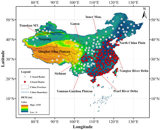 The Topography (m) map of China with distributions of the CINRAD. White dots represent C-band radars and red dots denote S-band radars [44].