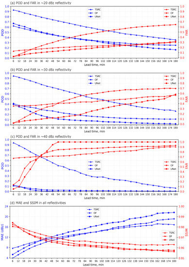 In terms of FAR, for all three reflectivity intervals, it is easy to find that FARs for TSRC climb slowly from 12 min to 3 h forecast times. In contrast, the increasing trends of FARs for both OF and UNet are relatively steep. In ∼20 and ∼30 dBz reflectivity intervals, although UNet acquires relatively low FARs, the PODs are also low, while the reverse occurs in TSRC. Note that in ∼40 reflectivity intervals, OF and UNet both produce lower FARs than in TSRC before 36 min lead times, but they rapidly climb to 0.8 at 1 h lead times, while all three models obtain relatively high FARs after 1 h lead time. Overall, our model ranks the best forecast after 1 h lead times.