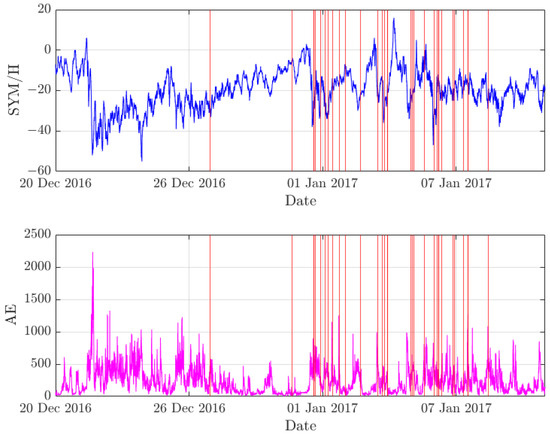 Geomagnetic activity during end of December 2016–beginning of January 2017. Upper plot demonstrates SYM/H index behavior, lower plot—AE-index. TUS event registrations are shown by red vertical lines.