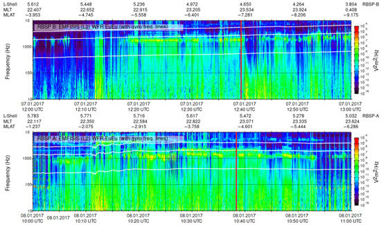 Van Allen Probes (VAP; formerly: Radiation Belt Storm Probes, RBSP) is a NASA project aimed at studying Earth’s radiation belts (http://vanallenprobes.jhuapl.edu/index.php) (accessed on 5 November 2022). This mission consists of two identical satellites (RBSPa and RBSPb), which were launched to a high-elliptical orbit on 30 August 2012. Orbital elements include inclination: 10, orbiting period: 9 h, apogee: 6 R, and perigee: 600–700 km. In November 2017, the VAP spacecraft orbit was in a pre-noon magnetospheric sector, while, in January 2017, in the dusk–midnight magnetospheric sector (http://rbspgway.jhuapl.edu/ExtendedMissionOrbit, accessed on 5 November 2022). VAP satellites payload included several instruments designed to measure energetic particles in the radiation belts: MagEIS that measures electron fluxes from 20 keV to about 4 MeV, and REPT that measures high-energy electrons up to ∼20 MeV. Additionally, electric and magnetic fields and plasma waves which are responsible for particle transport, acceleration, and loss are measured by EFW (Electric Field and Waves) and EMFISIS (Electric and Magnetic Field Instrument Suite and Integrated Science) Suites.