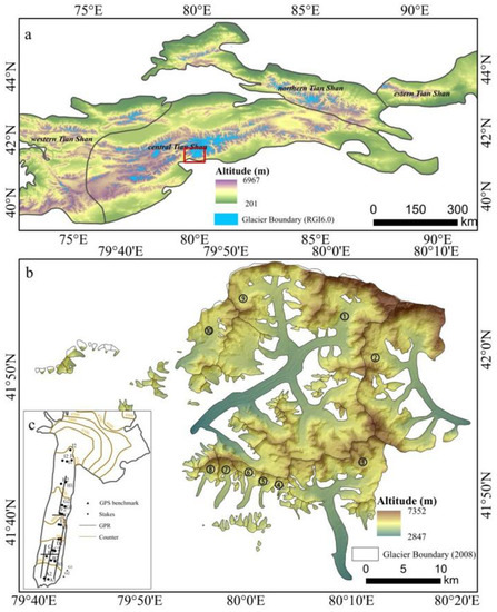 Geographic location of the Tomur Peak glacier, Tian Shan, China, (a) the regional glacier distribution, (b) the location of the study area in the Tian Shan Mountains, and (c) (① Tomor Glacier, ② Duntelian Glacier, ③ Keqikar Glacier, ④ Keke Ulong Glacier, ⑤ Keker Glacier, ⑥ Qiong Kurm Glacier, ⑦ Bingtan Glacier, ⑧ Qingbingtan Glacier No. 72, ⑩ Ailangsu Glacier) the distribution of stakes and GPR surveys on the Qingbingtan glacier No. 72.