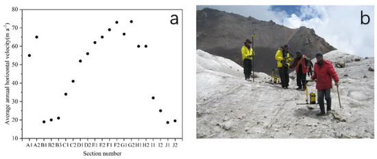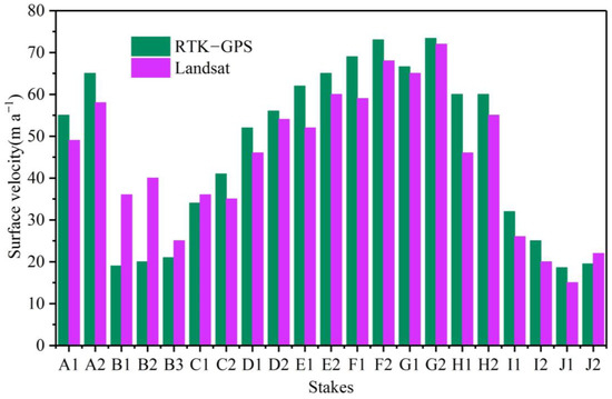 To verify the accuracy of the remote sensing analysis results of glacier surface velocity, this paper uses RTK-GPS and GPR data acquired on Qingbingtan Glacier No. 72 measured by CAS [35]. There are two GPS receivers, one installed at a fixed base point on a non-glaciated area to the southeast of the glacier margin and the other monitoring the ablation stakes on the glacier. The removal vectors could be estimated from two estimations made inside a specific period, which was used as the velocity of ice flow at the corresponding location point. In this case, the ice flow velocity is the surface velocity, which can be divided into two vectors, the horizontal and vertical velocity. The positions of the ablation stakes were recorded each summer from 2008 to 2009. The horizontal error of the GPS measurements was 0.02 m, the vertical error was 0.02–0.04 m [36], and the calculated glacier velocity error was within 8% of the input data.