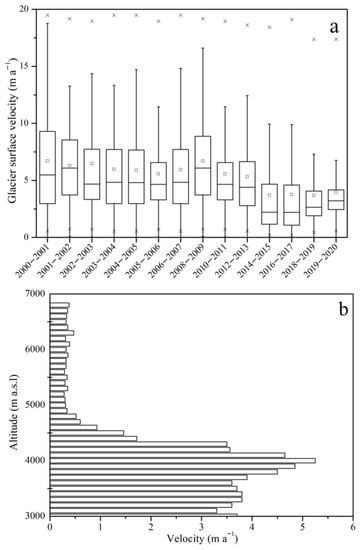 Glacier movement velocity is a basic parameter and is a combination of ice creep, glacier basal sliding, and glacier basal deformation. It is influenced by factors such as glacier topography and surface debris cover. The effect of elevation on glacier surface velocity can be seen in Figure 3b, which shows the average glacier surface velocity within each 100 m elevation rise. The higher glacier surface velocities observed between 3500–4500 m a.s.l may be because the glacier surface velocity in the upper mass transport of the accumulation zone is more variable due to the ice volume in the accumulation zone. It has been shown that regional ice accumulation tends to increase significantly after 1900 [55], which leads to an increase in the rate of transport from the accumulation zone to the ablation zone, and further may be one of the reasons for the higher glacier rates between 3500–4500 m a.s.l. The glacier ablation zone rate increased after 1990, and the rate of glacier ablation increased [52], which would lead to insufficient glacier recharge and consequently to a decrease in glacier rate below 3500 m a.s.l.
