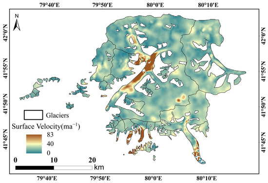 For valley glaciers, the greater the slope of the glacier surface, the greater the movement velocity, and the width of the ice surface also cause the glacier surface velocity to change. As the width becomes narrower, the glacier surface velocity increases, and vice versa [49]. The southern section of the a.s.l glacier zone (Kochikar Glacier, Kokol Glacier, Qiongkuermu Glacier, Bingtan Glacier, and Qingbingtan No. 72 Glacier) are typical dendritic glaciers, and their surface velocity maxima occur in the area where the glacier narrows from wide to narrow and slows down from the equilibrium line to the end, in addition to being near the glacier equilibrium line.