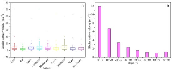 Influence of aspect and slope on glacier flow rate in the Tomur peak region, 2000–2020 (a,b).