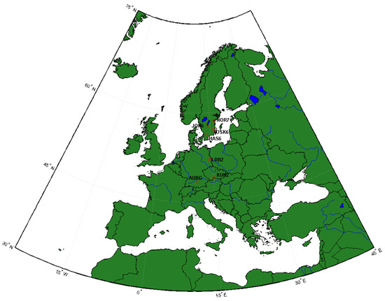 Observations from four (GPS, GLONASS, Galileo and BeiDou) GNSS systems collected at seven located in central Europe EPN stations were used for analysis (Figure 1). The geographical coordinates of used network points as well as hardware are presented in Table 1. Other detailed information can be found and EPN website (https://epncb.eu/, accessed on 27 December 2022).