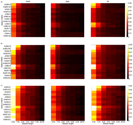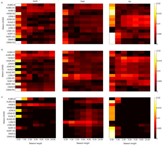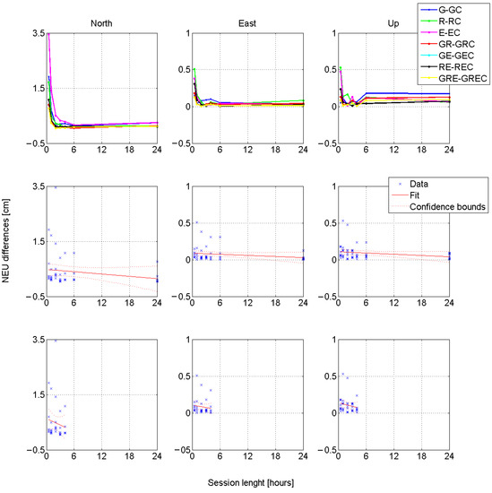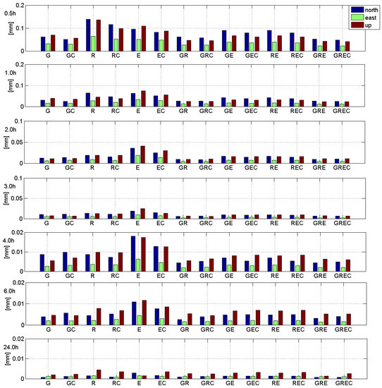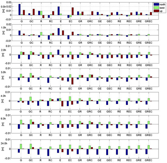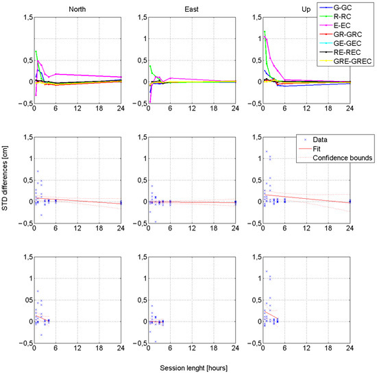 As shown in Figure 4, adding BeiDou observations visibly affects coordinate differences. The improvement is particularly noticeable for short, from 0.5 to 2 h, observation sessions in the autonomous processing variants (E-only, R-only, and G-only). More significant differences and related improvements for the North component can be noted in all processing variants. The reason for this phenomenon could be the limited visibility of the satellites of all systems in the northern region, the so-called “North hole”. In the case of autonomous solutions (especially for the Galileo system with incomplete SV constellation), where we especially observe an improvement, the inclusion of observations from BeiDou-2satellites corrects the geometry of the satellites, which is most prominent in the Northern component of the position. Obviously, it will be visible especially in the case of short observation sessions (in the range of 0.5 to 1.0 h). The resulting regression model coefficients for the position component, calculated for 24 and 4 h data windows, are shown in Table 7. As the most significant impact on results is seen in the case of autonomous solutions (Figure 4), linear regression model coefficients were calculated for these three variants and presented in Table 7. We decided to use linear regression, as it is most often used in similar analyses [34,35].