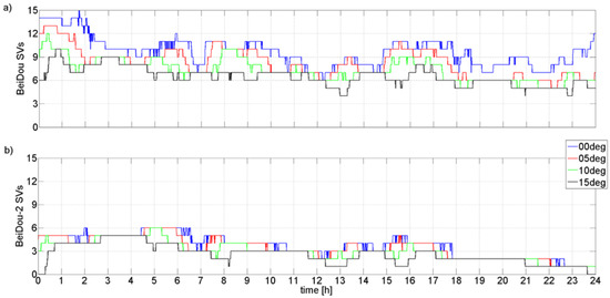 An additional analysis was conducted in the case of one randomly selected, example station. For this purpose, we chose the AUBG station, the first one on the station list. First of all, as was mentioned in the Introduction, the BeiDou-2 spacecrafts transmit the B1, B2, and B3 frequency bands while BeiDou-3 satellites transmit legacy B1 signals similar to the BeiDou-2 satellites, as well as modernized signals in the L1, E5, and B3 band. The transition from BeiDou-2 to BeiDou-3 can result in some challenges in fully utilizing its capabilities. In the GAMP software (official ver. 20 December 2017 made available for use under a GNU license), it manifests as the impossibility to use BeiDou-3 observations in dual-frequency PPP post-processing. The user can select a navigation system in a binary setup mode. On the other hand, official settings do not allow the selection of preferred signals to be processed [30]. Consequently, in our analysis, only BeiDou-2 observations contributed to solutions. Figure 6 presents BeiDou satellites’ visibility over central Europe for four elevation masks: 0 deg, 5 deg, 10 deg, and 15 deg in the case of all available BeiDou SVs and BeiDou-2 SVs only.