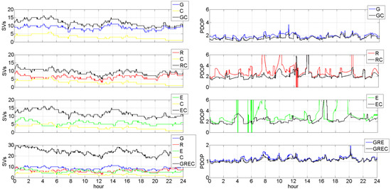 The best rate of improvement in the mean number of SVs was obtained for all autonomous solutions (G-only, R-only, E-only), while the weakest rate was obtained for the GRE variant. In the case of the PDOP ratio, the best, above 20%, improvement was obtained for R and E solution.