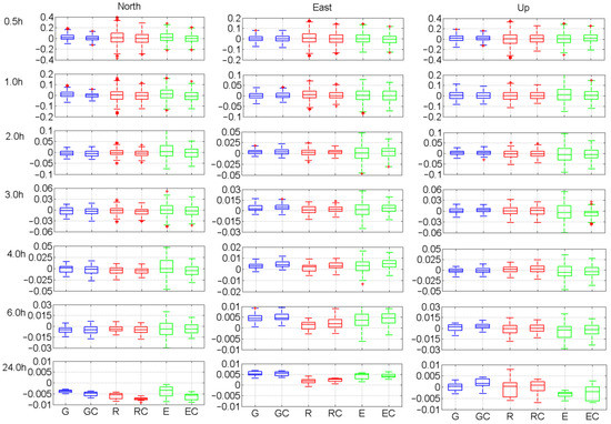 Box whisker plots for time series of position components differences: from 0.5-h session to 24 h session. Please note the different scales on vertical axis.
