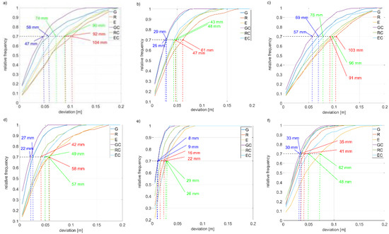 In the next step, the results obtained for the shortest sessions (0.5 h and 1.0 h) were presented using cumulative histograms in Figure 11. This was conducted to get a more detailed insight into differences visible in results obtained in three autonomous processing variants. In this case, the variants of the autonomous processing and their corresponding studies with adding BeiDou observations were analyzed.
