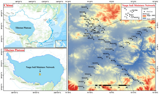 Figure 1. Distribution of CTP-Naqu in situ SM stations. The text above the black dots in the image on the right shows the name of each site.