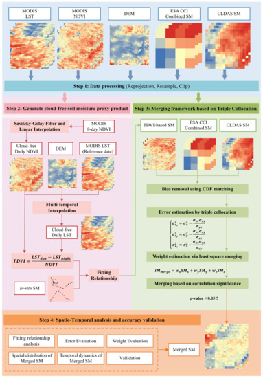 As shown in Figure 2, all data were preprocessed and resampled to 1 km at first. Soil moisture retrieval from optical data was carried out as follows: i) Daily NDVI products were generated by Savitzky-Golay (SG) filter algorithm [46] and linear interpolation. ii) The multi-temporal interpolation method was utilized to create the daily seamless LST product using daily NDVI, DEM, and MODIS LST data. iii) Temperature difference-vegetation index (TDVI) was proposed to retrieve SM from the interpolated NDVI and LST. Subsequently, we combined optical (TDVI-based), microwave (ESA CCI combined), and reanalysis (CLDAS) soil moisture products into triples. The deviation between the three products was corrected using the CDF matching algorithm, and the relative error of each product was estimated by the TC approach. Finally, the merged daily SM products at 1 km resolution were obtained based on the least square merging and relevant significance test, followed by an evaluation against station observations.