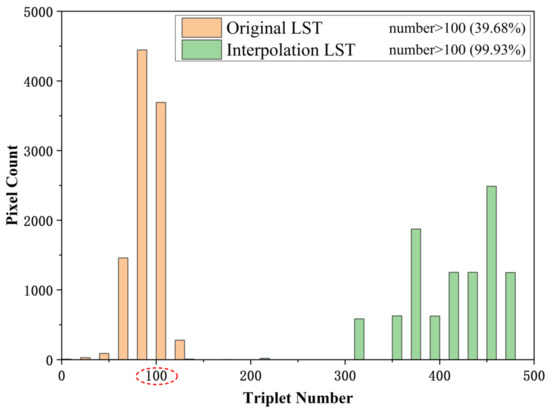 Figure 4. A comparison histogram of the number of available triples (orange columns are the number of triples before LST interpolation, green columns are after interpolation).