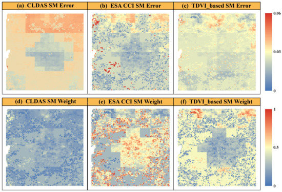 Figure 5. Relative error and weight distribution maps of CLDAS, ESA CCI, and TVDI-based SM products.
