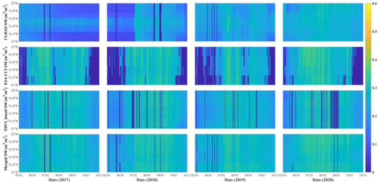 Figure 6. Hovmöller (time-latitude) diagrams of CLDAS, ESA CCI combined, TDVI-based, and merged SM products for the study period (every May to October from 2017 to 2020).
