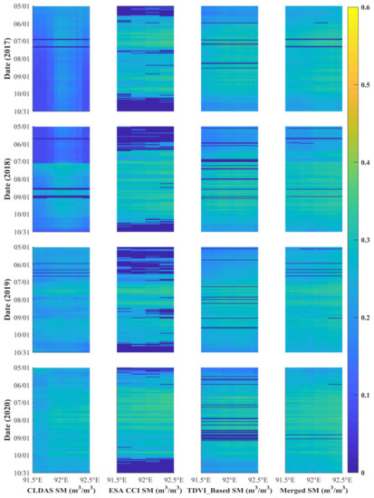 Figure 7. Hovmöller (time-longitude) diagrams of CLDAS, ESA CCI combined, TDVI-based, and merged SM products during the study period (every May to October from 2017 to 2020).