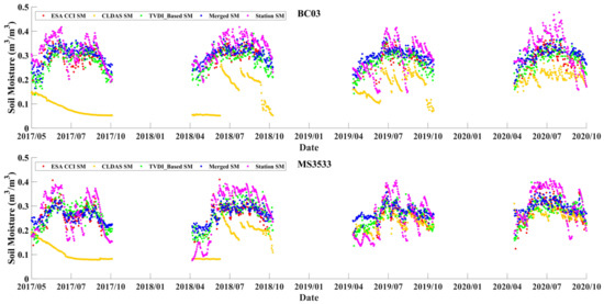 Figure 8. Temporal evolution of ESA CCI combined, CLDAS, TDVI-based, merged and in situ SM at BC03 and MS3533 sites.
