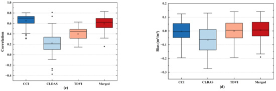 Figure 9. Comparison of statistical metrics ((a) ubRMSE, (b) RMSE, (c) Correlation, (d) Bias) among ESA CCI combined, CLDAS, TDVI-based, merged SM in validation with the in situ measurements.