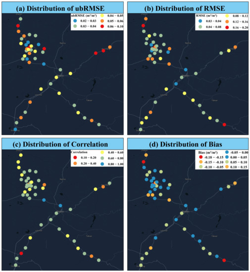Figure 10. Spatial distributions of (a) ubRMSE, (b) RMSE, (c) Correlation, and (d) Bias for the merged SM against in situ SM observations.
