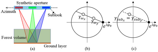 (a) Schematic representation of TF analysis over the homogeneous forest with a horizontal underlying topography. (b,c) Corresponding coherence loci of the polarimetric observations and sublook observations in the complex unit circle, respectively.