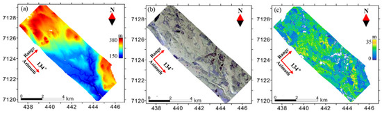 Image of the study area: (a) LiDAR-derived DEM. (b) Pauli-basis polarization composite map for the L-band SAR data (R: HH − VV; G: HV; B: HH + VV). (c) LiDAR-derived CHM.B.