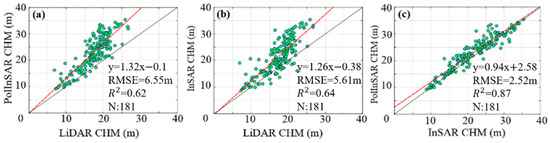 Comparison of the forest CHM results: (a) PolInSAR RVoG-derived CHM vs. LiDAR-derived CHM; (b) InSAR TF-RVoG-derived CHM vs. LiDAR-derived CHM; (c) PolInSAR RVoG-derived CHM vs. InSAR TF-RVoG-derived CHM.