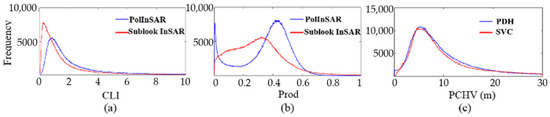 Histograms of the indexes (a) CLI, (b) prod, and (c) PCHV derived by the PolInSAR RVoG method (blue curves) and InSAR TF-RvoG method (red curves) in the single-baseline case.