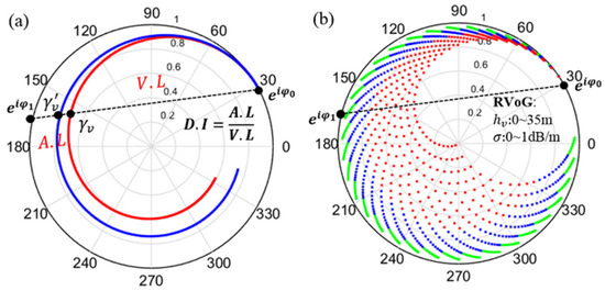 Coherence loci representation in the unit circle. (a) Search method of the pure volume coherence; the black finite line between and is the coherence line. is the pure volume coherence without regard to the residual ground scattering error, and is the corresponding improved result. is the length between and , and is the length between and . The red and blue curves are the selected coherence loci before and after using the limited , respectively. (b) Coherence loci limited by the empirical relationship of and ; (where the CHM ranges from 0 to 35 m, and the ranges from 0 to 1 dB/m). if , and then , as shown in the green region; if , and then , as shown in the blue region; if , and then , as shown in the red region.