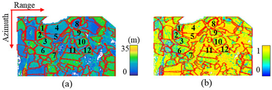 Validation stands for the estimation of the temporal decorrelation factor (red polygons). (a) The LiDAR-derived CHMs. (b) The temporal decorrelation factors derived from the RVoG + VTD model.