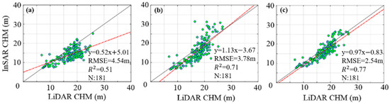 The estimated InSAR CHM versus LiDAR-derived CHM based on the RVoG + VTD model with: (a) a fixed ; (b) a fixed ; and the RVoG + MTD model with: (c) , where and can be estimated by the linear fitting between the CHM and , as shown in (28).