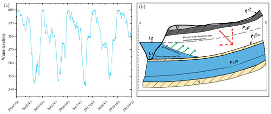 The distribution of the Xiluodu aquifers changed significantly after water impoundment. The geological setting mainly comprises three water-repellent layers (i.e., S, P2βn, and P2x) and three water-permeable layers (i.e., P1 m, P2β, and Q) [23]; see Figure 3b. The highest water level is 600 m, which is lower than the elevation of the sandy shale layer (P2x). Therefore, only the P1 m and P2β permeable bed layers are directly connected with the reservoir water during the process of impoundment. The potential energy of Xiluodu water increases with the water level. For the P1 m limestone permeable bed layers in a pressurized state, the water permeates the P1 m layer through the exposed limestone area, increasing the P1 m pressure potential energy. For the P2β basalt permeable bed layers in a state of low pressure, the water will directly flow into the P2β layer through the submerged basalt area (see the green arrow in Figure 3b), causing the P2β layer to be saturated gradually.