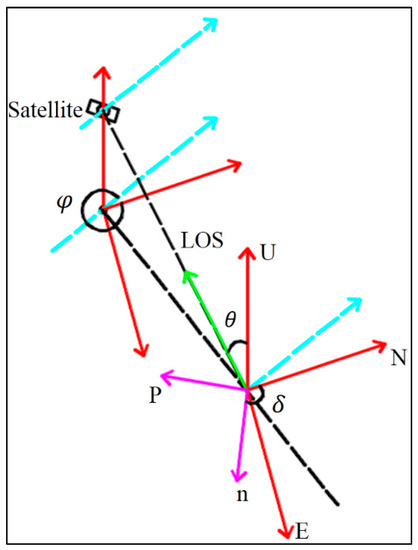 Schematic diagram of LOS decomposition. The red arrow represents the local east, north, up (ENU) coordinates; the blue arrow represents the flight direction of the satellite; the green arrow indicates the LOS direction; and are the azimuth and incident angle of the satellite, respectively; is the azimuth angle of a predefined direction; and directions are defined local coordinate systems.