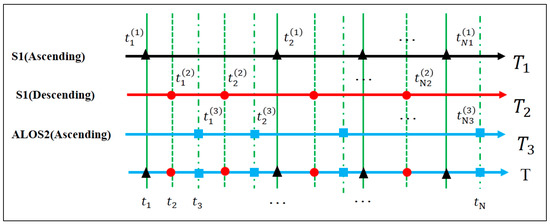 Assuming that the acquisition times are unique for different pieces of SAR data, the total number of images is . The times of all of the data acquisitions are . The corresponding LOS time-series deformations sequence are , and ; then, the merged LOS time-series deformations are .