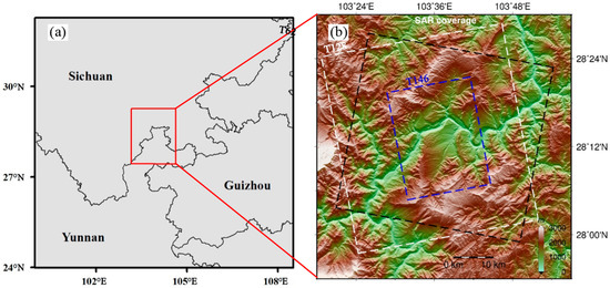 (a) Study area; (b) SAR data coverage area. The white dashed box represents the Sentinel-1 ascending data, and the black dashed box represents the Sentinel-1 descending data. The blue dashed box represents the ALOS2 ascending data.