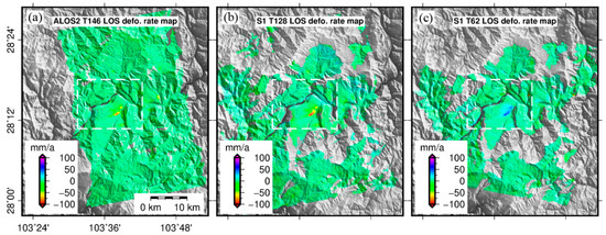 (a) Mean velocity map of ALOS2 ascending; (b) mean velocity map of Sentinel-1 ascending; (c) mean velocity map of Sentinel-1 descending.