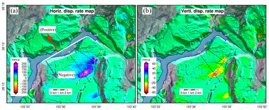 Figure 9 shows the average rate map of the Sentinel-1 data and ALOS2 data obtained using the SBAS technique. The reference point was selected in the same stable area farther from the deformation zone. For the Yongshan County area, the ALOS2 ascending data LOS has a maximum average speed of −90 mm/a; the ascending Sentinel-1 data LOS has a maximum average speed of −110 mm/a; and the descending Sentinel-1 data LOS has a maximum average rate of 60 mm/a (positive values represent proximity to the satellite and negative values represent the distance from the satellite). For the ALOS2 ascending data and the Sentinel-1 ascending data, the incident angles are 31.4° and 39.29°, respectively. The reasons for the different deformation rates may be as follows: (1) the data incident angles are different, resulting in different observational geometry; (2) Xiluodu horizontal shifts may occur in the reservoir area, resulting in different projections onto the LOS backward direction. For the Sentinel-1 ascending data and the descending Sentinel-1 data, the deformation rate results are opposite, indicating that the horizontal displacement must occur in the Yongshan County area. Therefore, we needed to achieve this in order to decompose and obtain horizontal displacement and vertical displacement.