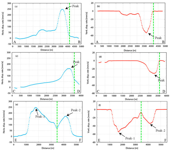 (a) is the horizontal displacement rate of profile line A–B; (b) is the vertical displacement rate of profile line A–B; (c) is the horizontal displacement rate of profile line C–D; (d) is the vertical displacement rate of profile line C–D; (e) is the horizontal displacement rate of profile line E–F; (f) is the vertical displacement rate of profile line E–F. The green line represents the suspected fault.