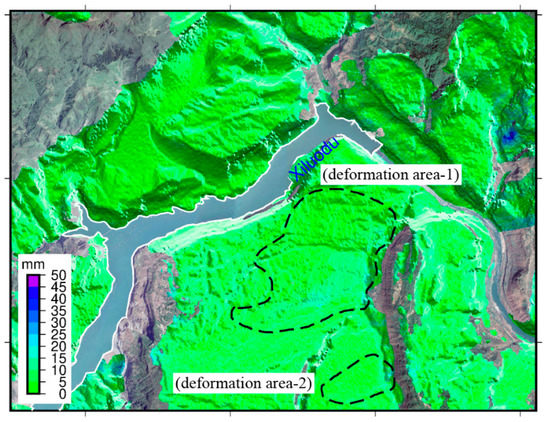 The Xiluodu Hydropower Station is located upstream of the Jinsha River in China. As the world’s third-largest hydropower station, the Xiluodu Hydropower Station has experienced frequent landslides and other geohazards since its impoundment in 2013. In 2013, the Huangping landslide, with an inflow of earthworks amounting to 20 × 104 , caused 12 deaths. The Ganhaizi landslide, with an influx of earthworks of 7800 × 104 , was the largest landslide that occurred at the Xiluodu Hydropower Station [21]. LIANG Guohe [22] and ZHOU Zhifang [23] used the leveling points and valley-shrink surveying lines, respectively, to monitor subsidence and valley-shrink deformation around the shoreside of the Xiluodu reservoir and the Xiluodu arch dam, and their results showed that the Xiluodu arch dam and the shoreside of the reservoir were under valley-shrinkage deformation of 50 mm, accompanied by about 25 mm subsidence. Additionally, ZHOU Zhifang [23] pointed out that valley-shrinkage deformation is highly correlated with the water level. In 2017, LI Lingjing [24] analyzed the Yizicun landslide with ALOS, ASAR, and TerraSAR datasets and found that there was a push-type landslide before the water impoundment and that the landslide changed to a pull-type after the water impoundment.