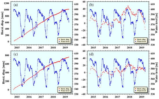 Relationship between horizontal displacement and impoundment. (a) is the relationship between the deformation sequence and water level in the horizontal direction of point P1 in Figure 10; (b) is the deformation sequence in (a) that removes the linear trend; (c) is the relationship between the deformation sequence and water level in the horizontal direction of point P2 in Figure 10; (d) is the deformation sequence in (c) that removes the linear trend.