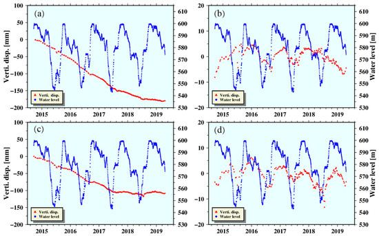 Relationship between vertical displacement and water storage. (a) is the relationship between the deformation sequence and water level in the vertical direction of point P1 in Figure 10; (b) is the deformation sequence in (a) that removes the linear trend; (c) is the relationship between the deformation sequence and water level in the vertical direction of point P2 in Figure 10; (d) is the deformation sequence in (c) that removes the linear trend.
