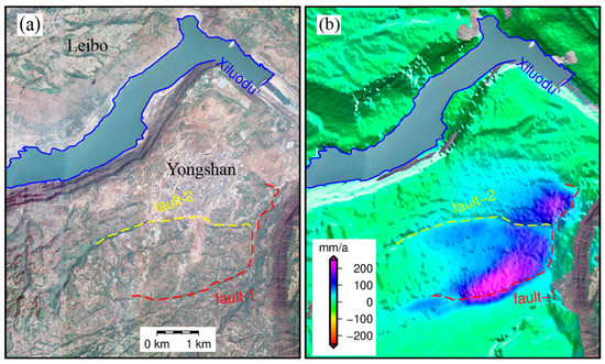 As a clean and recyclable resource, hydroelectricity is receiving increasing attention from all countries [1]. Inevitably, the rapid development of China’s economy has led to a huge demand for energy. Southwest China has abundant water resources for the construction of hydropower stations, so it has obtained a reputation as the “Asian battery” [2]. However, the impounding of a reservoir changes the conditions of local hydrogeology and the regional gravity field, resulting in ground deformation [3]. Furthermore, fluctuations in water level accelerate the deformation, causing local geohazards. In 1961, a landslide with a volume of about 165 × 104 occurred in the Zixi Reservoir in Zishui, Hunan Province, causing 40 deaths [4]. In 1963, a landslide occurred in the Vajont Reservoir in Italy; a huge volume of landslide soil (about 270 × 106 ) rushed into the reservoir, and the surge caused 1925 deaths [5].