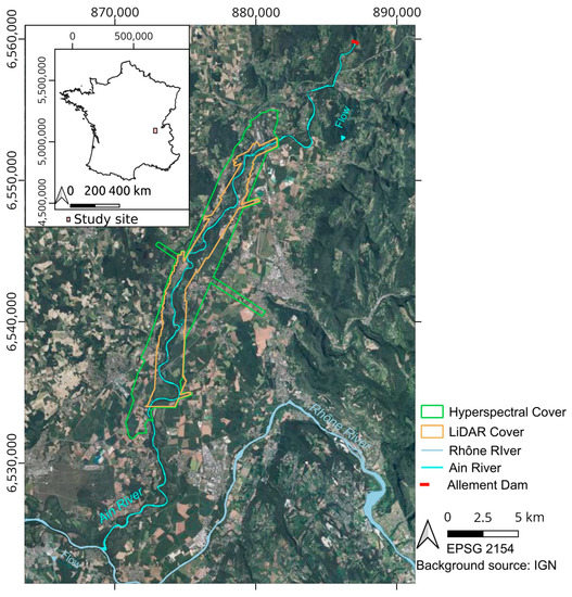 The study area is located on the Ain River, which is a large meandering gravel-bed river that is one of the main tributaries of the upper Rhône River, France (Figure 1). In the early 20th century, its fluvial pattern shifted from a braided one towards a sinuous single-thread pattern [62]. Changes in pastoral and silvicultural practices after the Second World War led to colonization of the river’s terrestrial margins [63] by a riparian forest whose main species are black poplar (Populus nigra) and European ash (Fraxinus excelsior).