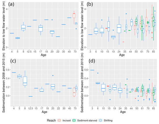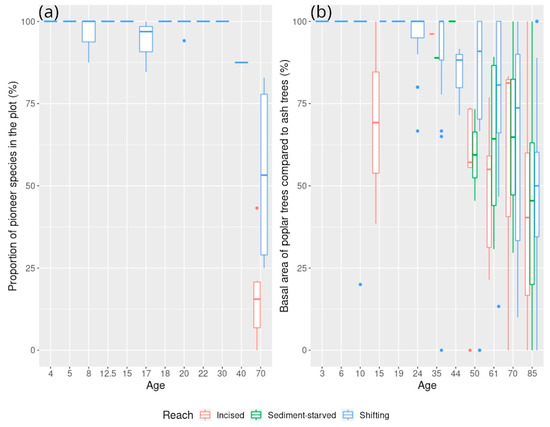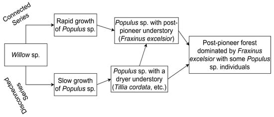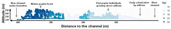 The free meandering pattern of the Ain River leads to erosion of the older portions of the riparian forest and the creation of gravel bars that are colonized by willow species (Salix alba, Salix elaeagnos) that trap finer sediments and progressively aggrade, allowing colonization by poplars [64]. As the black poplars reach a height greater than that of the willows, other species appear in the understory, such as Norway maple (Acer platanoides), sycamore (Acer pseudoplatanus) and small-leaved lime (Tilia cordata) on dryer soils, while the pioneer willows die off (Figure 2). In older portions of the forest, Fraxinus excelsior overtakes Populus nigra as the most abundant species in the forest. In addition, invasive species, such as ash-leaved maple (Acer negundo) and Japanese knotweed (Fallopia japonica), tend to colonize the younger more-connected portions of the forest, to the detriment of the typical early pioneer species, such as willows.