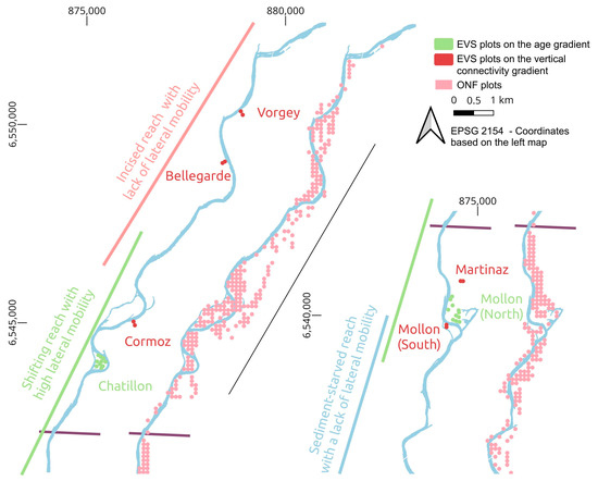 In comparison, the vertical connectivity gradient includes forest plots that are of the same age (70–80 years) but are spread out across differing levels of lateral mobility and channel incision. These plots were chosen on the basis of previous studies conducted by Dufour [63] that highlighted differences in the growth of European ash, depending on the elevation of forest plots, relative to the water level of the river, which affects the distance to groundwater and the frequency of flooding. We consider them to be mature forest plots in the case of the Ain River riparian forest because they belong to the later successional stages identified by the ONF and to some of the oldest sectors of the riparian forest.