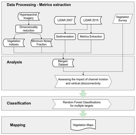 The methodology used in this paper is divided into four different steps, as shown in Figure 4. First, forest indicators were extracted from the LiDAR and hyperspectral data, providing information about the forest structure, spectral reflectance, and the topography of the corresponding forest plot. Then, this expanded dataset was coupled with the vegetation field surveys, in order to explore the characteristics of the riparian forest along an age gradient from early pioneer individual trees that have not yet reached maturity to later successional stages dominated by 50+ year poplars and post-pioneer species. By simultaneously exploring these characteristics along differing geomorphic reaches, we then studied how forest plots of a given age are impacted by reach-scale geomorphic features, such as channel incision and sediment starvation.