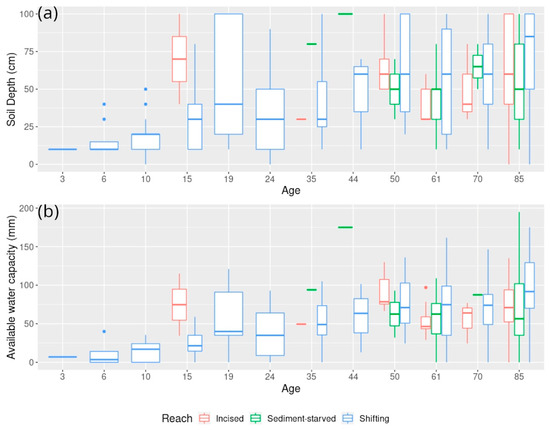 The data processing phase was then followed by a more classical analysis of forest characteristics, in which they were plotted against the age of the forest and grouped by geomorphic reach (incised, shifting, and sediment-starved). This allowed for visualization of the impact of age on the riparian forest by looking at how individual characteristics evolved through time, and also allowed for trends in forest plots between geomorphic reaches of the same age to be distinguished.