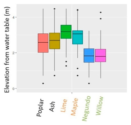 4.2. Data Analysis: Studying the Riparian Forest by Assessing the Impact of Channel Incision and Vertical (Dis) Connection to the River System